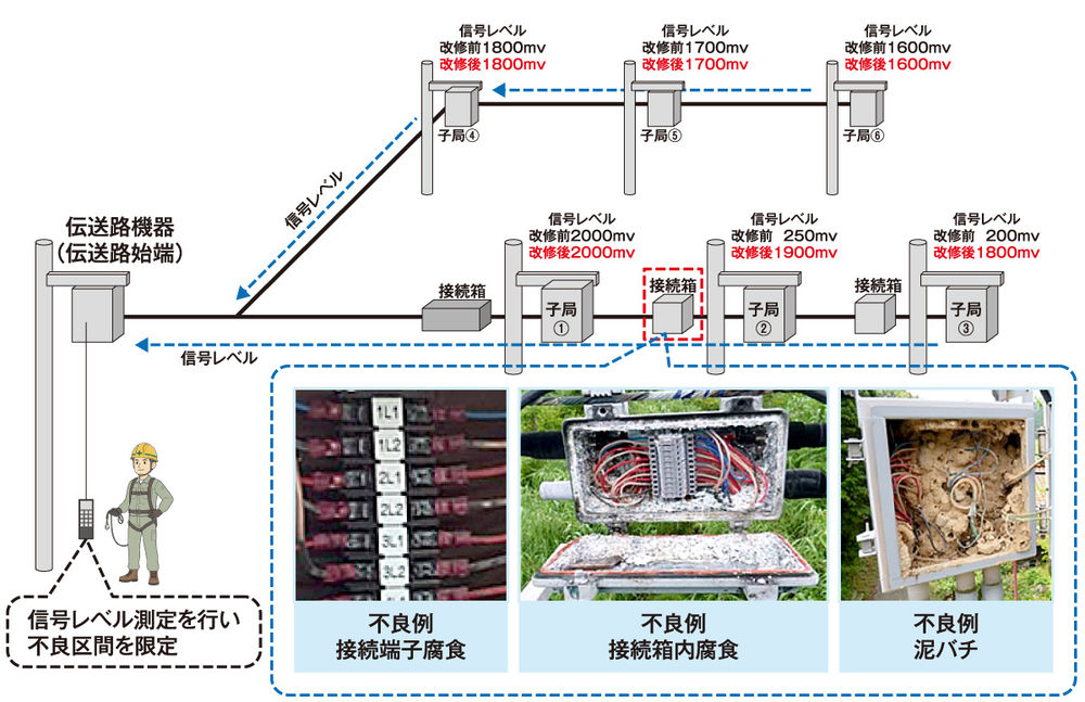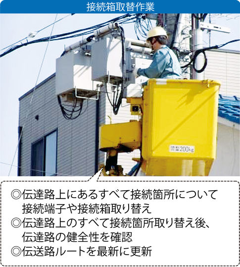 障害対応等による応急処置では対応出来ない配電遠制伝送路(メタルケーブル)について系列内全ての接続箇所の確認を行い、接続端子や接続箱の取り替えを実施します。