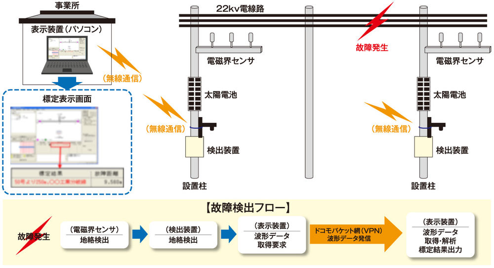 FASTは、送電線故障時に発生する電圧・電流サージを、送電線両端の変電所または鉄塔に設けた検出局の非接触センサでキャッチし、両検出局に電圧・電流サージが届いた時間差とそのサージ波形を解析局にて解析し、故障地点を特定するシステムです。