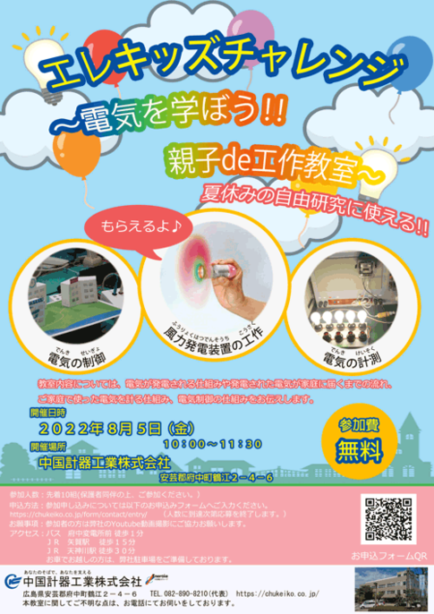 2022年8月5日(金)にエレキッズチャレンジ ~電気を学ぼう!!親子de工作教室~ を広島県安芸郡府中町の小学生を対象に開催いたします。