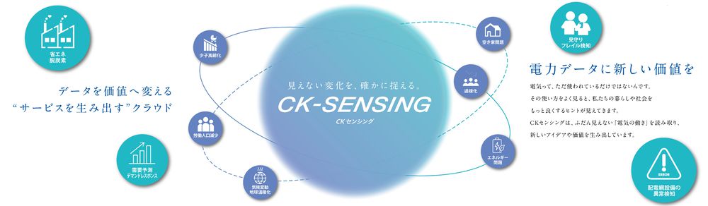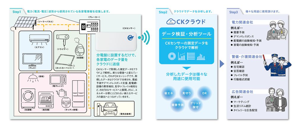 CKセンシングは宅内分電盤に設置したCKセンサー等で収集した家電毎の電力データを、お客さまの利用目的に合わせた様式で提供する「電力データサービスプラットフォーム」です。